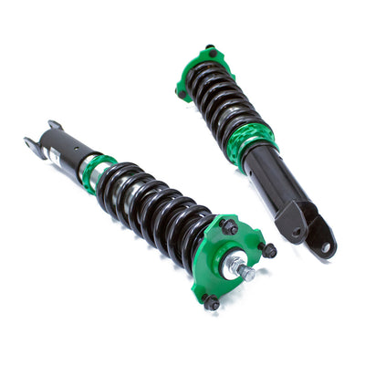 Hyper-Street II coilover suspension upgrade features mono-tube shocks with 32 clicks rebound settings and full length adjustable. Mono-tube shocks provides larger capacity for gas and oil to improve comfortable level of typical lowering vehicle. Special 32 clicks of valving allows user to fine tune rebound force settings. Independent spring tension and full length adjustable allows drop without sacrifice comfort by shorten pitch distance.