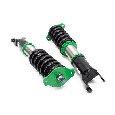 Hyper-Street II coilover suspension upgrade features mono-tube shocks with 32 clicks rebound settings and full length adjustable. Mono-tube shocks provides larger capacity for gas and oil to improve comfortable level of typical lowering vehicle. Special 32 clicks of valving allows user to fine tune rebound force settings. Independent spring tension and full length adjustable allows drop without sacrifice comfort by shorten pitch distance.
